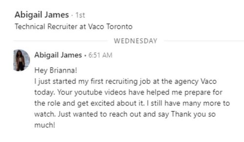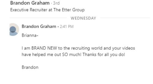 “I want to start off by thanking you for your awesome videos, they have really helped me pinpoint my recruiting weak points and also helped me ace my interview! I am quite a fan now and live by your videos. I would love to connect on LinkedIn, your energy is awesome. “Money is just the vessel..””